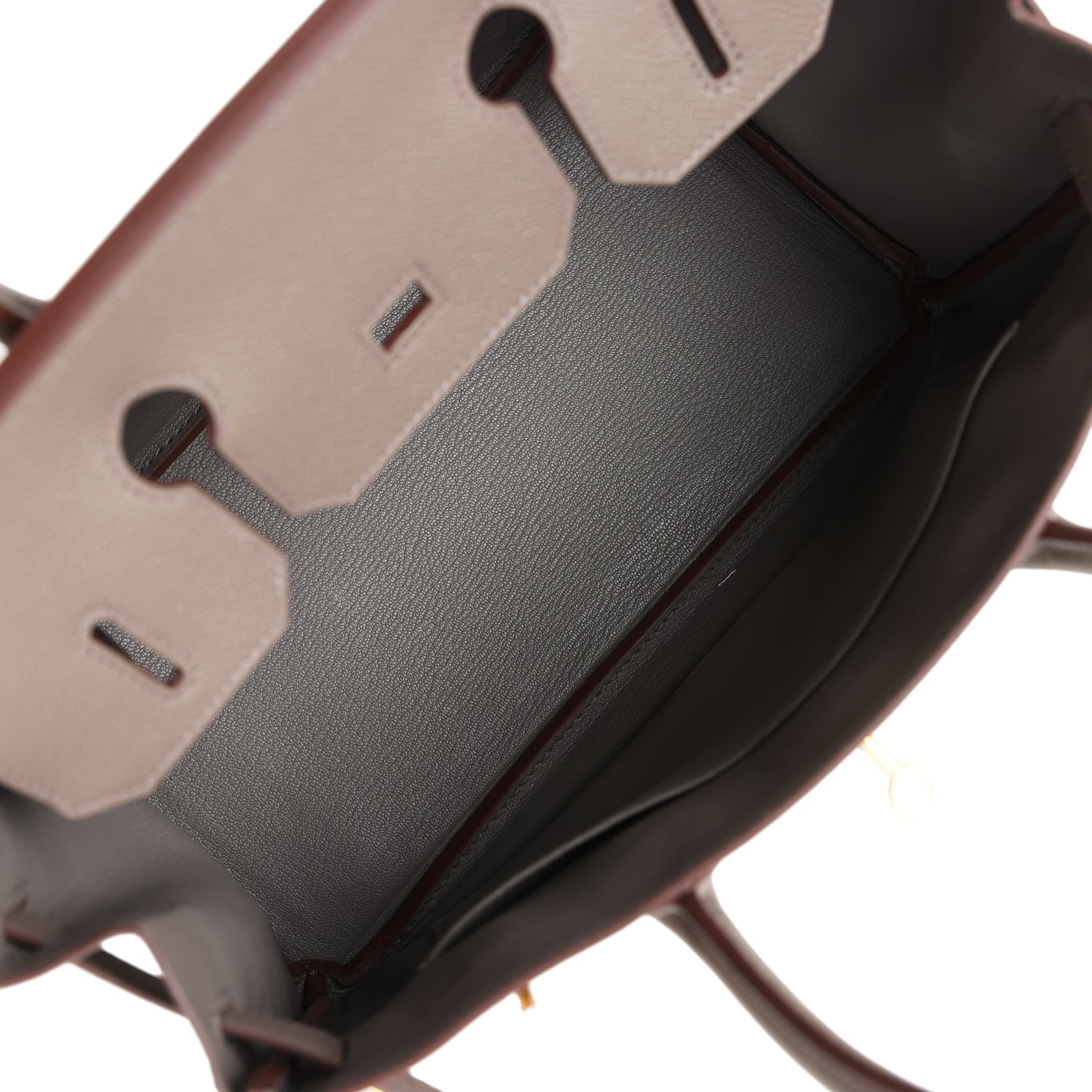 The interior is lined with Etain chevre and has one zip pocket with an Hermès engraved zipper pull and an open pocket on the opposite side.