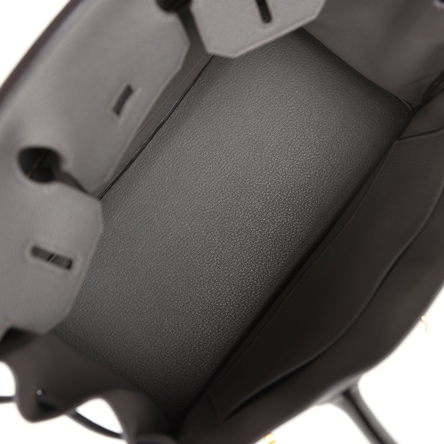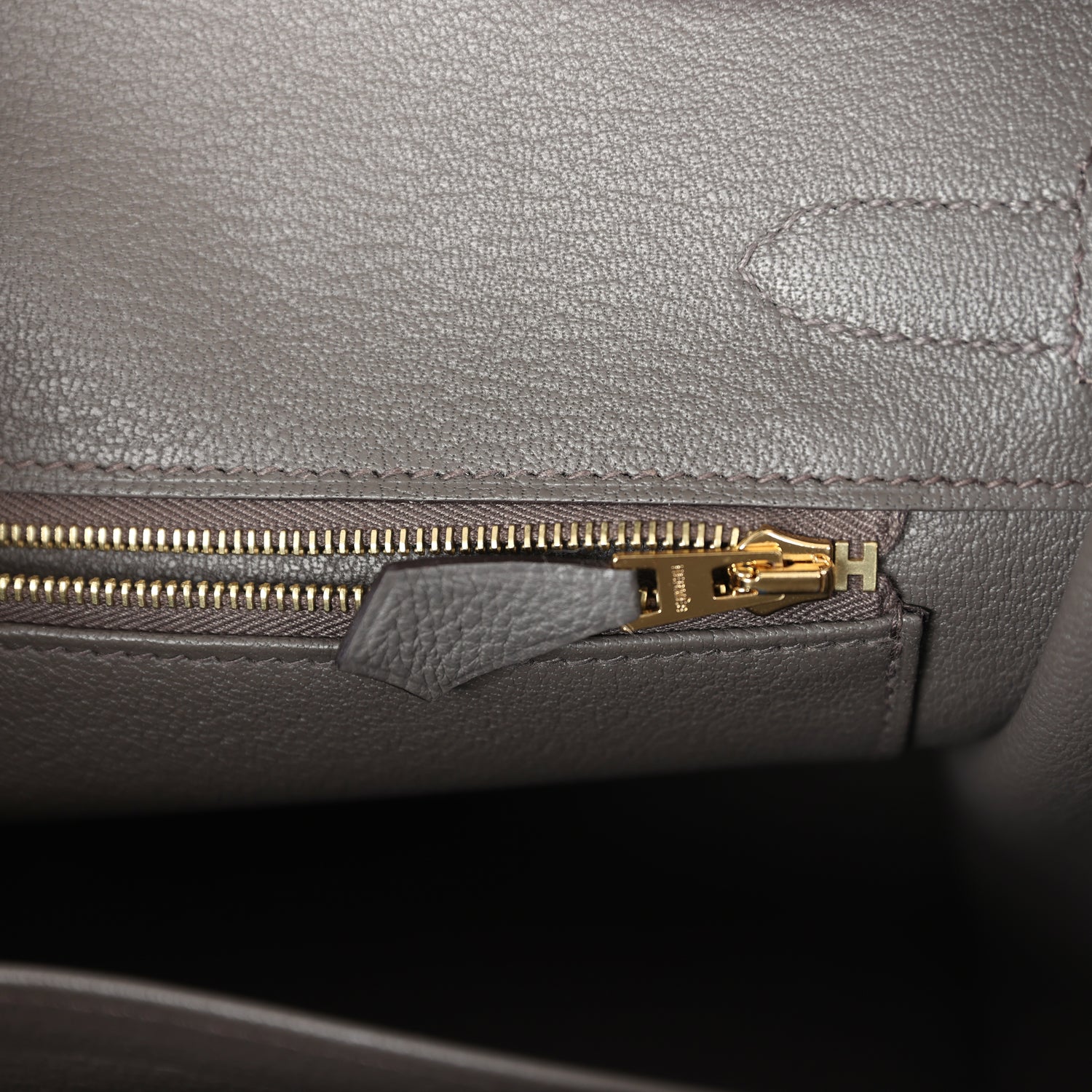 The interior is lined with Etain chevre and has one zip pocket with an Hermès engraved zipper pull and an open pocket on the opposite side.