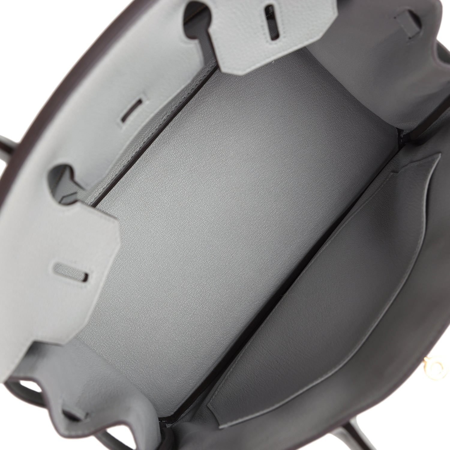 The interior is lined with Gris Mouette chevre and has one zip pocket with an Hermès engraved zipper pull and an open pocket on the opposite side.