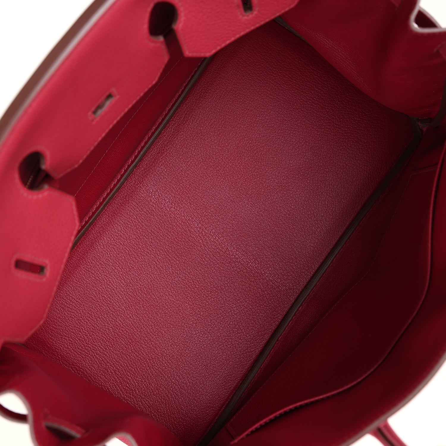 The interior is lined with Rubis chevre and has one zip pocket with an Hermès engraved zipper pull and an open pocket on the opposite side.