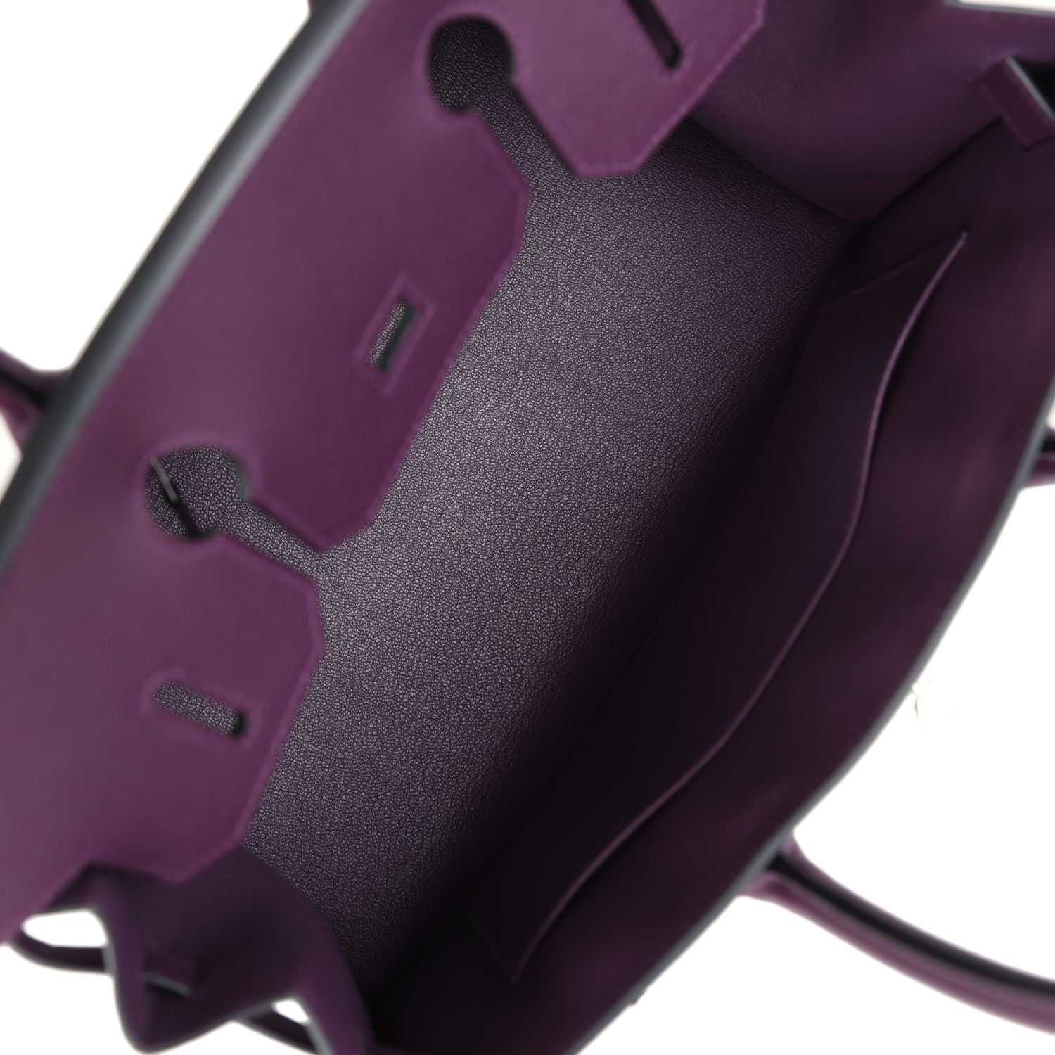 The interior is lined with Cassis chevre and has one zip pocket with an Hermès engraved zipper pull and an open pocket on the opposite side.