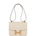 This Constance is in Craie epsom leather with brushed gold hardware and has tonal stitching, a metal “H” snap lock closure and adjustable shoulder strap.