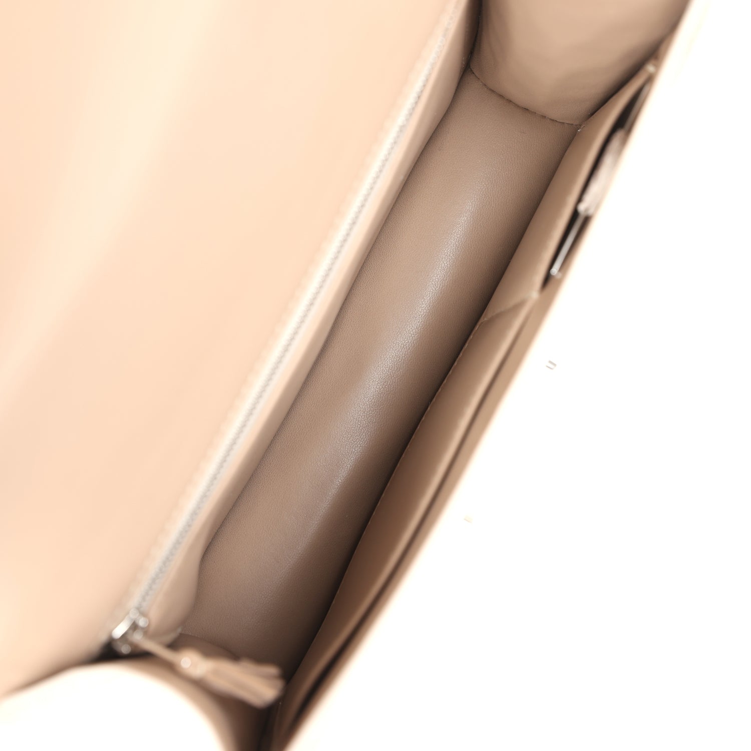 The interior is lined with Gris Tourterelle lambskin and has two open pockets on the front wall, one with a removable mirror, and a back zip pocket.
