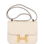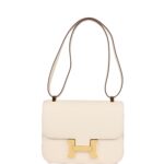 This Constance is in Nata epsom leather with gold hardware and has tonal stitching, a metal “H” snap lock closure, and adjustable shoulder strap.