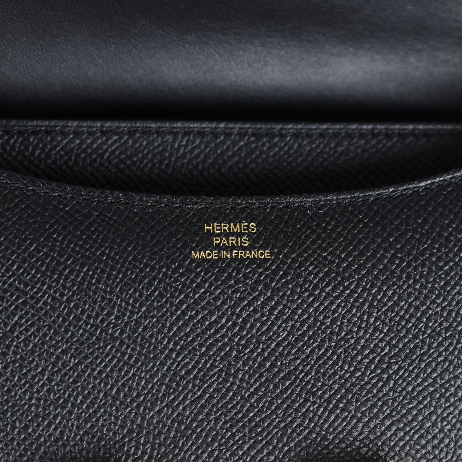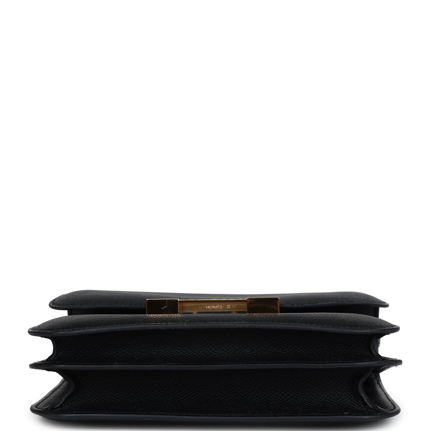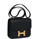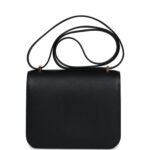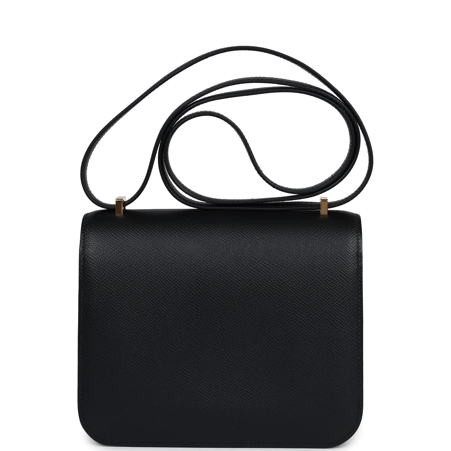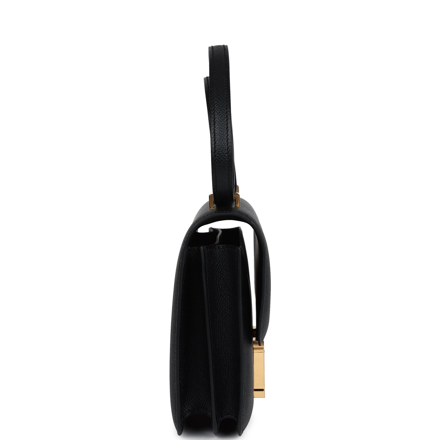 This Constance is in Black epsom leather with gold hardware and has contrast stitching, a metal “H” snap lock closure and adjustable shoulder strap.