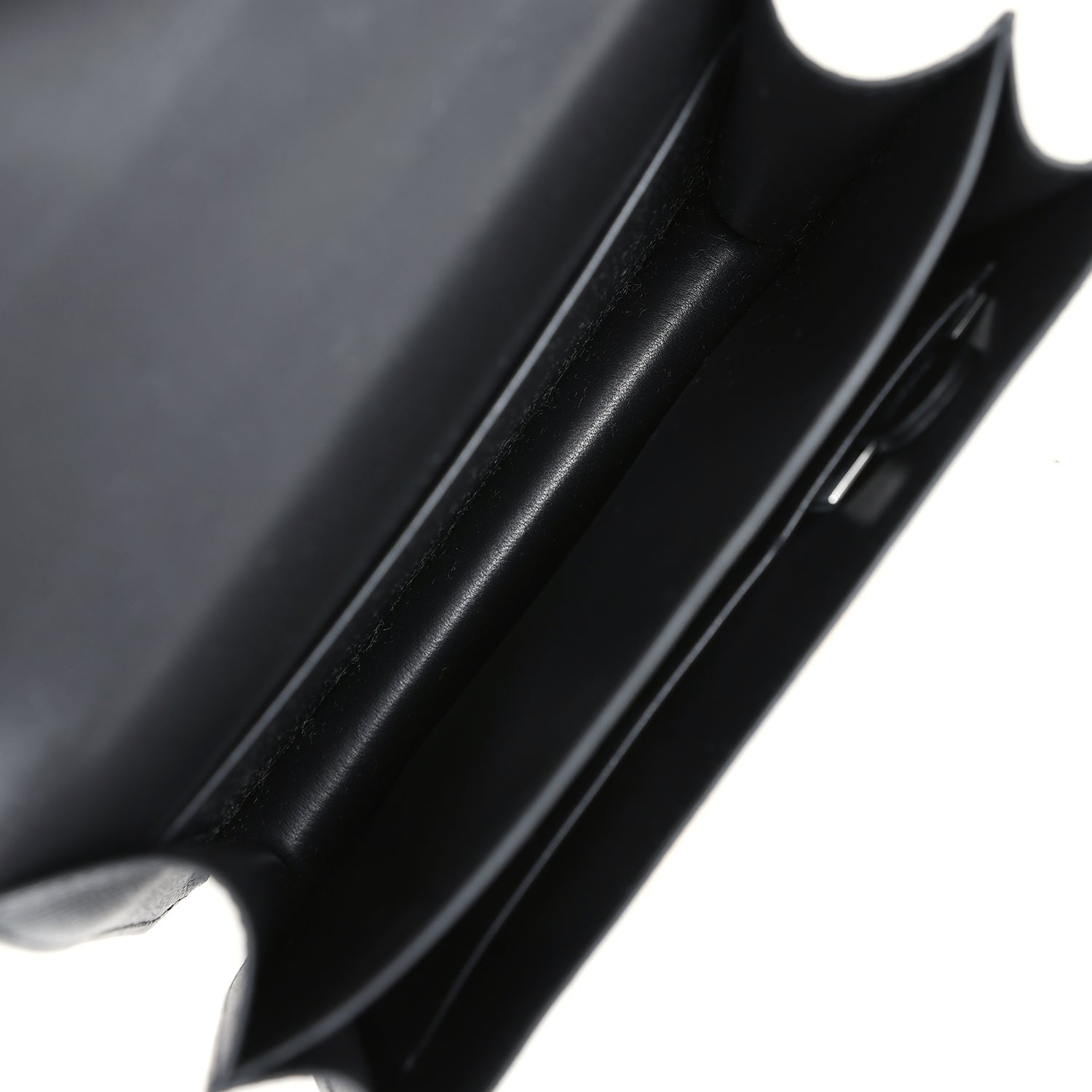 The interior is lined with Black lambskin and has an open pocket on the front wall, a center divide, removable mirror and a slit pocket on the back wall.