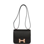 This Constance is in Black epsom leather with rose gold hardware and has tonal stitching, a metal “H” snap lock closure and adjustable shoulder strap.