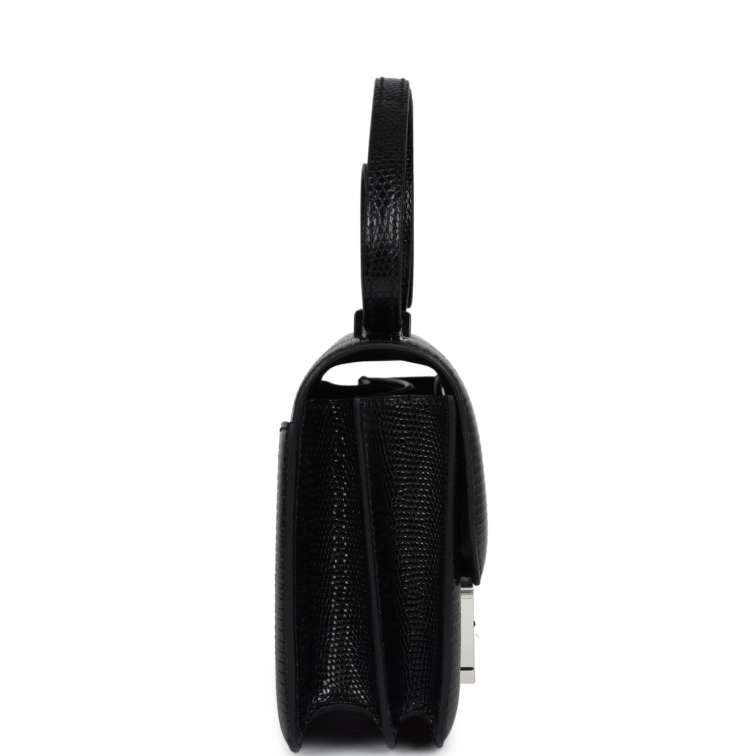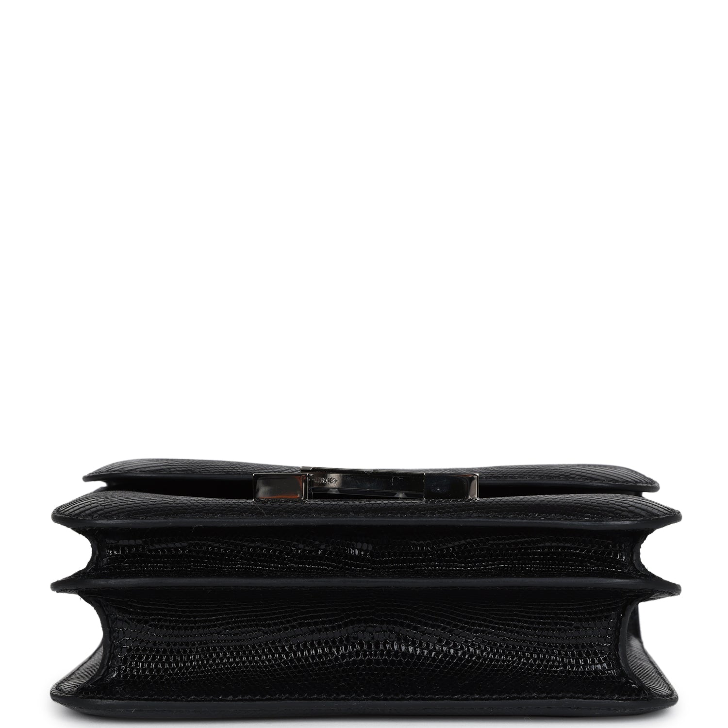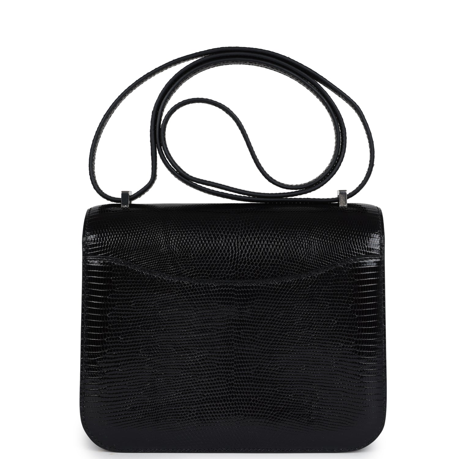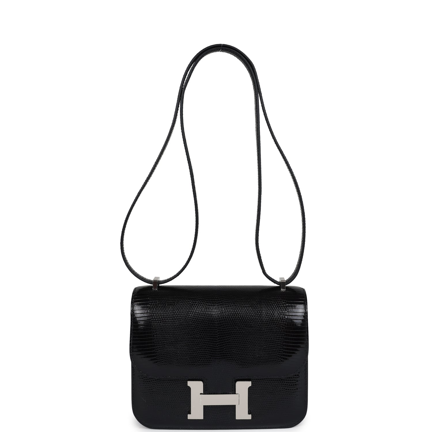 This Constance 1-18 is in Black Varanus Salvator Lizard leather with palladium hardware and has tonal stitching, a palladium “H” snap lock closure and adjustable shoulder strap.