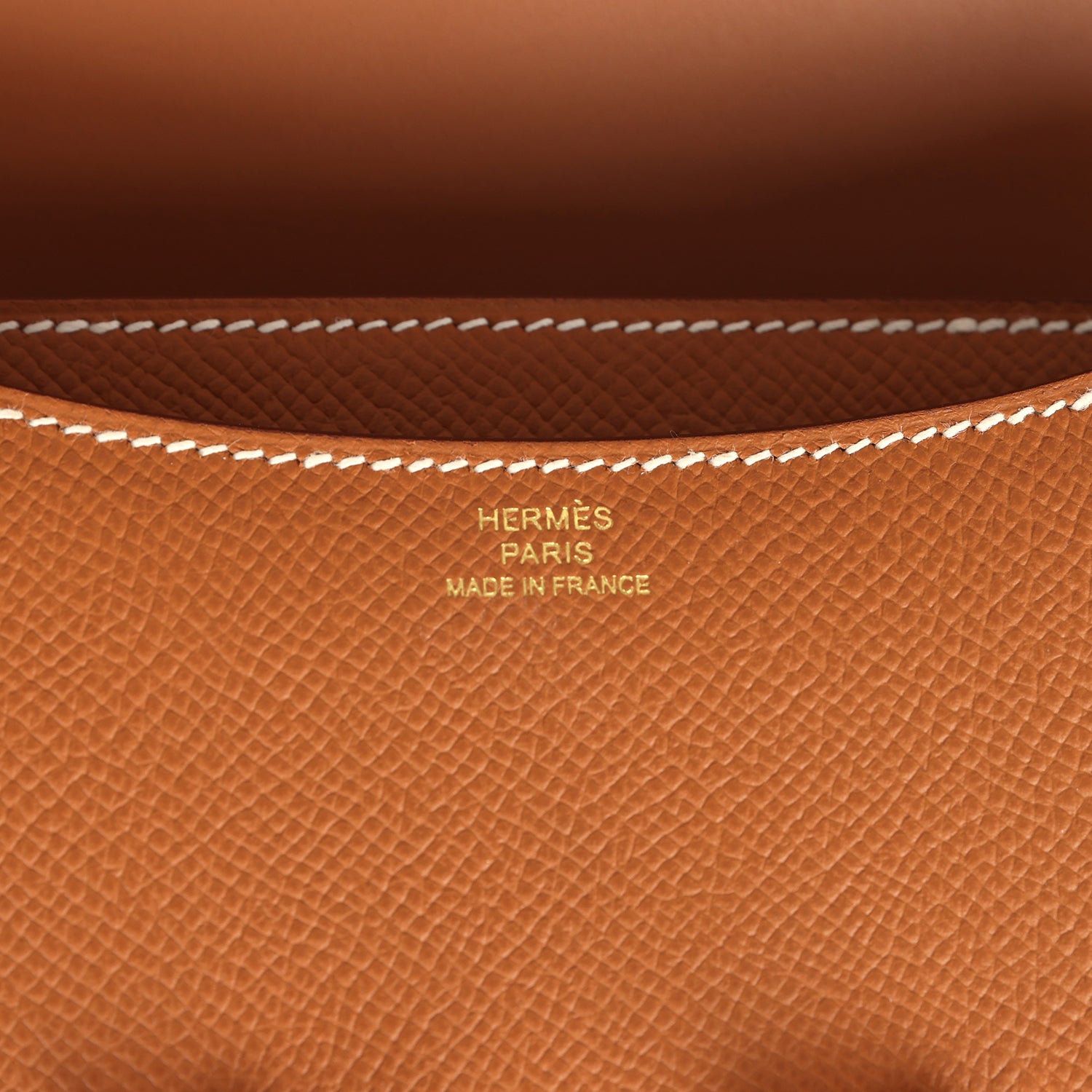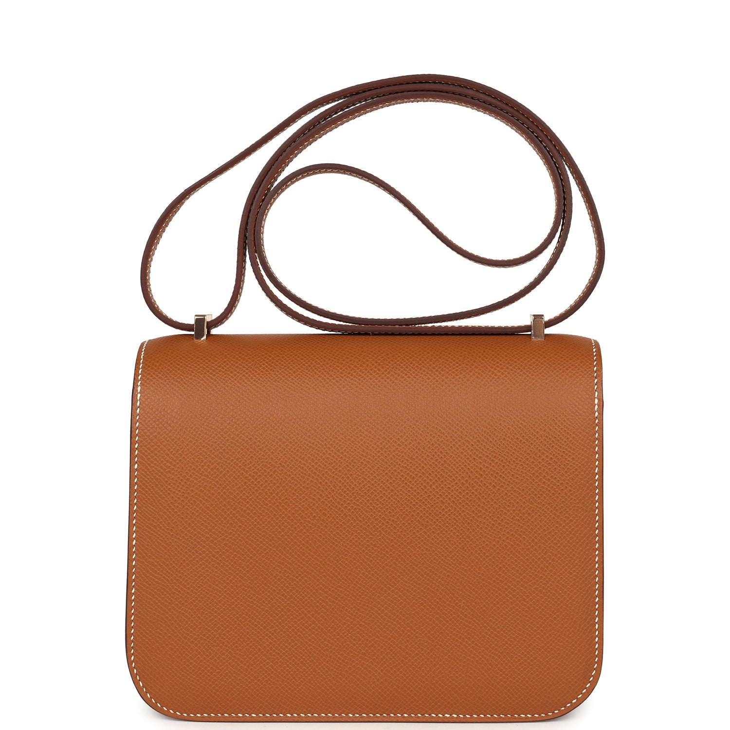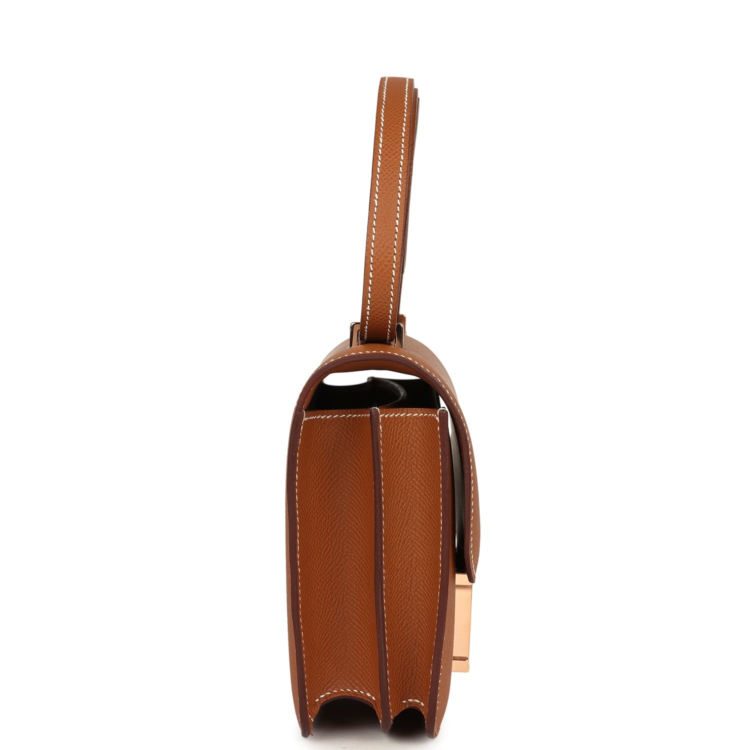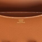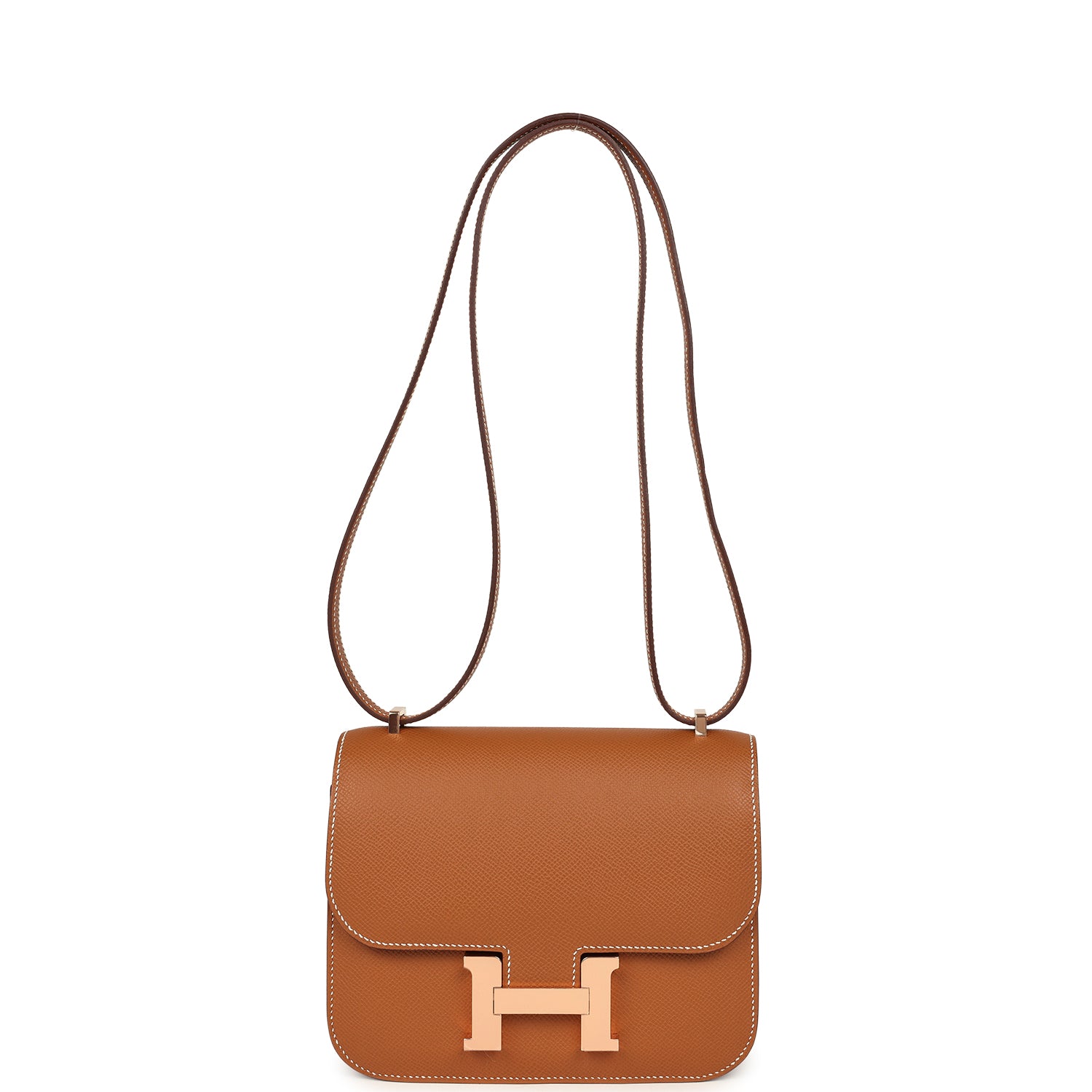 This Constance is in Gold epsom leather with rose gold hardware and has contrast stitching, a metal “H” snap lock closure and adjustable shoulder strap.