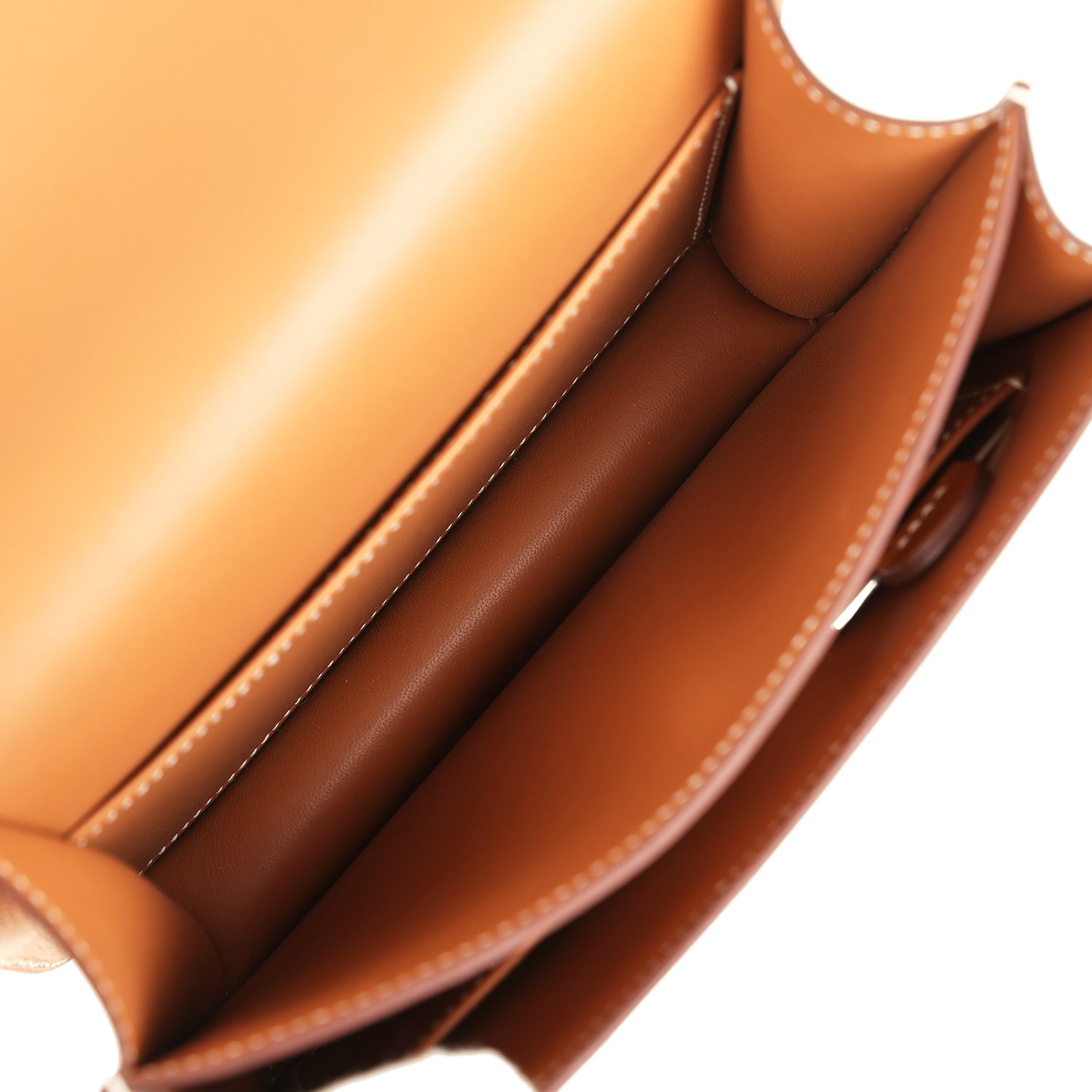 The interior is lined with Gold lambskin and has an open pocket on the front wall, a center divide, removable mirror and a slit pocket on the back wall.