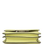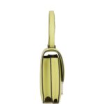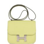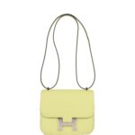 This Constance is in Jaune Bourgeon chevre leather with palladium hardware and has tonal stitching, a metal “H” snap lock closure and adjustable shoulder strap.