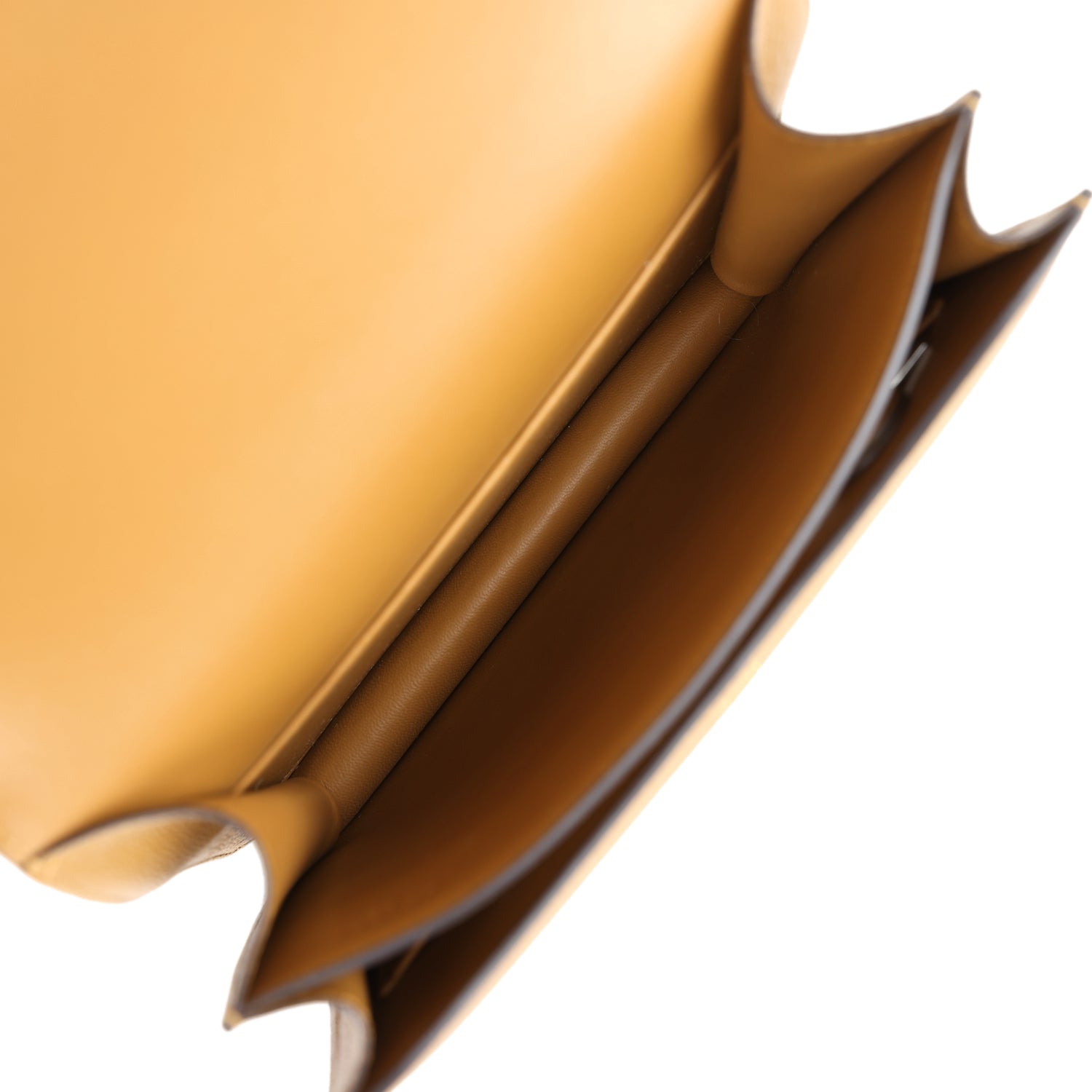 The interior is lined with Kraft lambskin and has two open pocket on the front wall, a removable mirror, a center divide, and a slit pocket on the back wall.