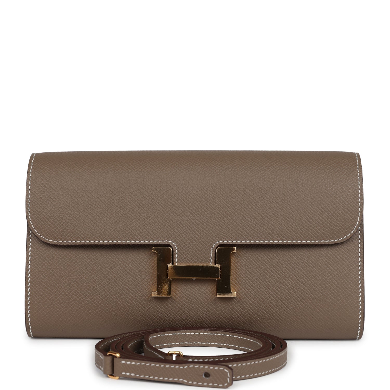 This Constance Wallet To Go is in Etoupe epsom leather with gold hardware and has contrast stitching, metal “H” snap lock closure, open front compartment and removable crossbody strap.