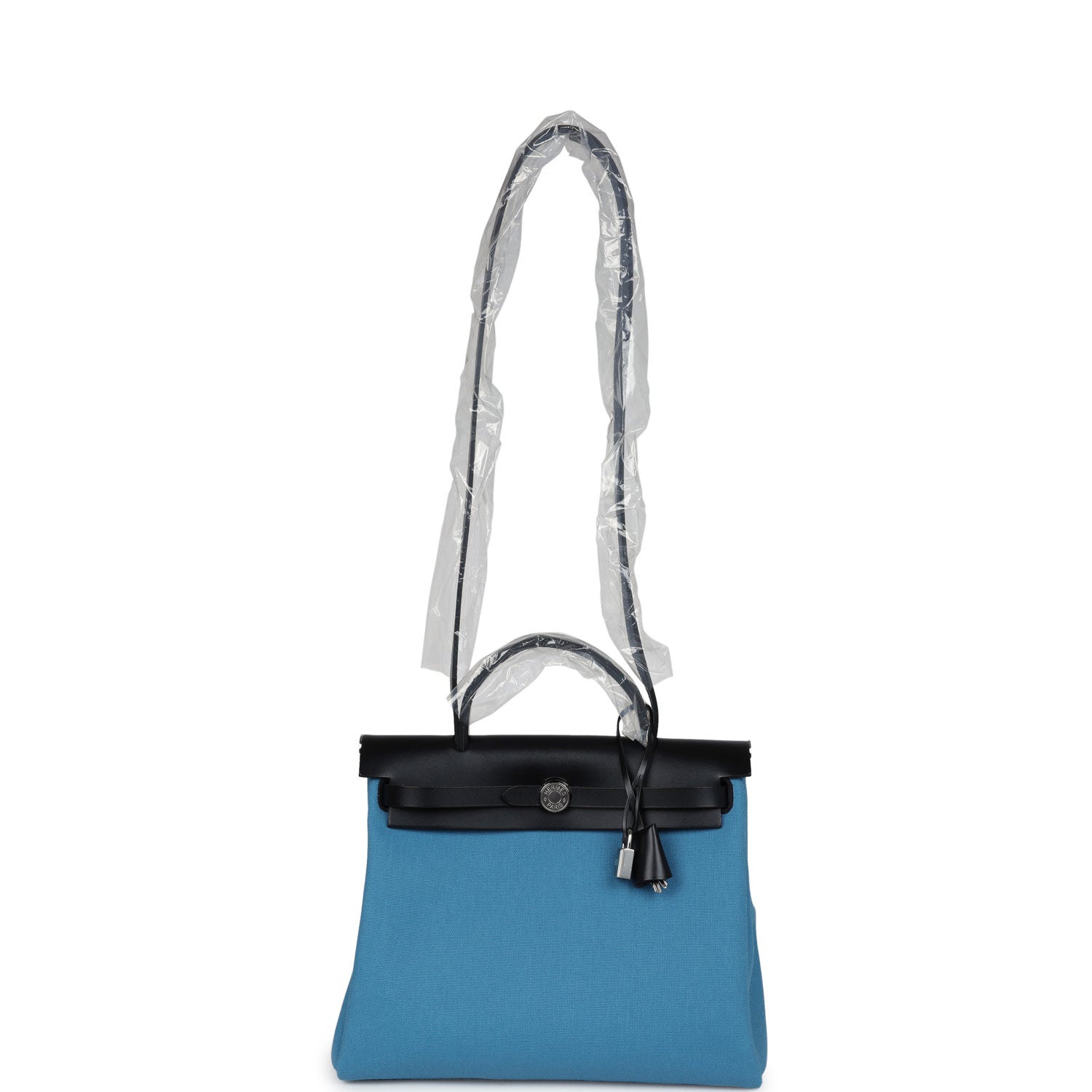 This Herbag Zip PM is of Blue Jean Toile H and Black Vache Hunter leather with palladium hardware and has tonal stitching, front flap, two straps with center clou de selle closure, clochette with lock and two keys, back zip pocket, single rolled handle and shoulder strap.