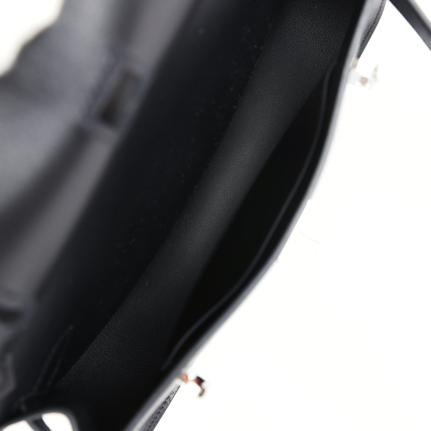 The interior is lined with Black lambskin and has one open pocket on the front wall.