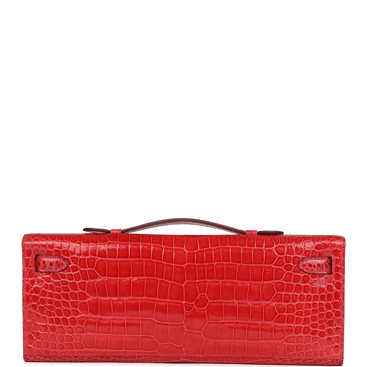 This Kelly Cut is in Bougainvillea shiny porosus crocodile with gold hardware and has tonal stitching, two straps with front toggle closure and a top flat handle.