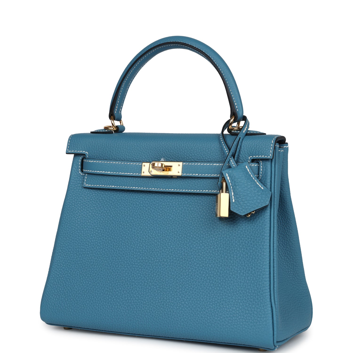 This Kelly, in the Retourne style, is in New Blue Jean togo leather with gold hardware and has contrast stitching,front flap, two straps with center toggle closure, clochette with lock and two keys, single rolled handle and removable shoulder strap.