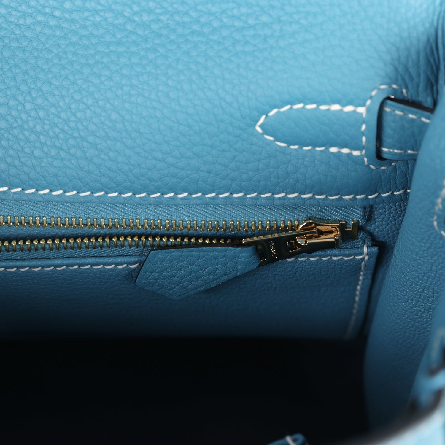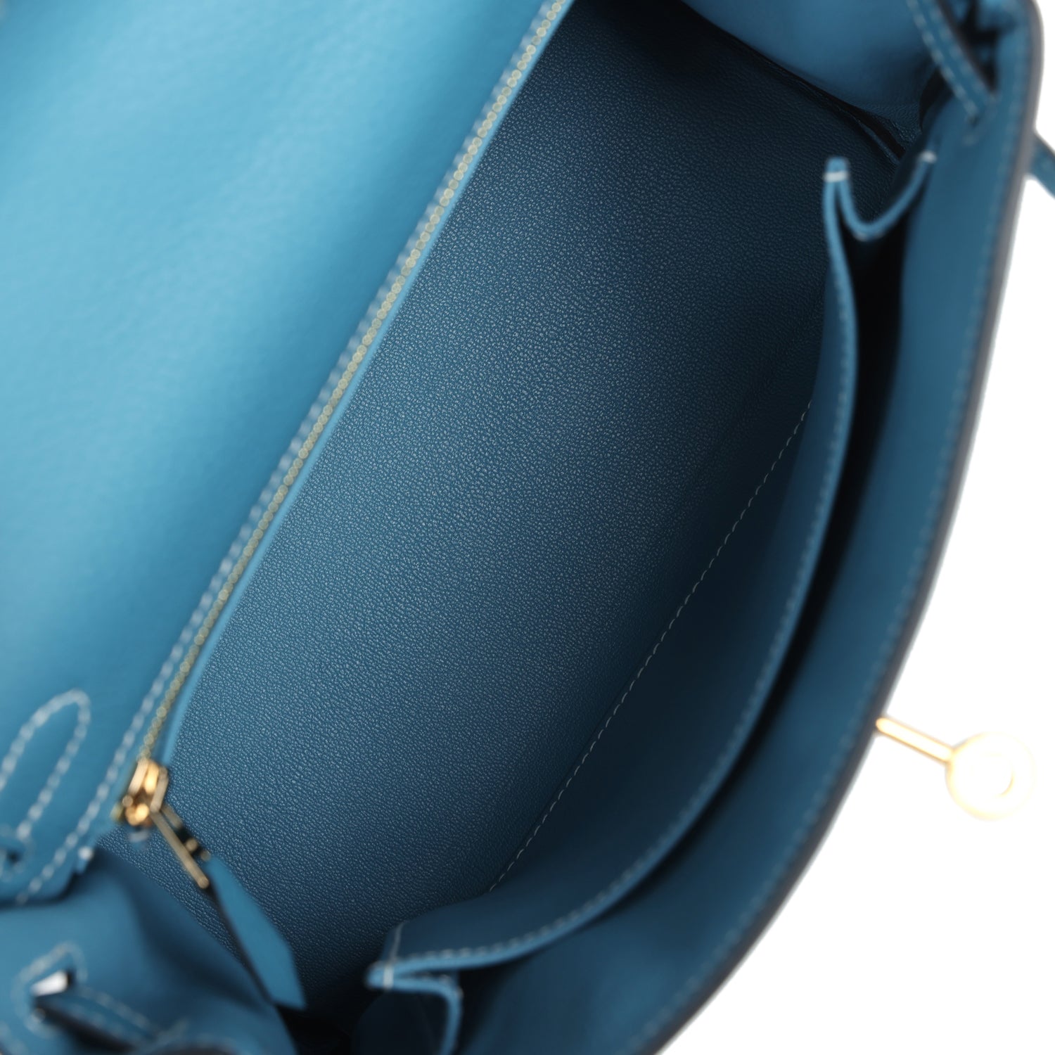 The interior is lined in New Blue Jean chevre and has one zip pocket with Hermès engraved pull and one open pocket on the opposite side.
