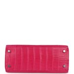 This Kelly, in the Retourne style, is in Framboise Matte Mississipiensis Alligator leather with palladium hardware and has tonal stitching, front flap with two straps, front toggle closure, clochette with lock and two keys, a single rolled handle, and removable shoulder strap.