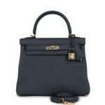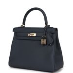 This Kelly, in the Retourne style, is in Gris Misty togo leather with permabrass hardware and has tonal stitching, two straps with front toggle closure, clochette with lock and two keys, single rolled handle and removable shoulder strap.