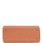This Kelly is in gold togo leather with palladium hardware and has contrast stitching, front flap, two straps with center toggle closure, clochette with lock and two keys a single rolled handle and removable shoulder strap.