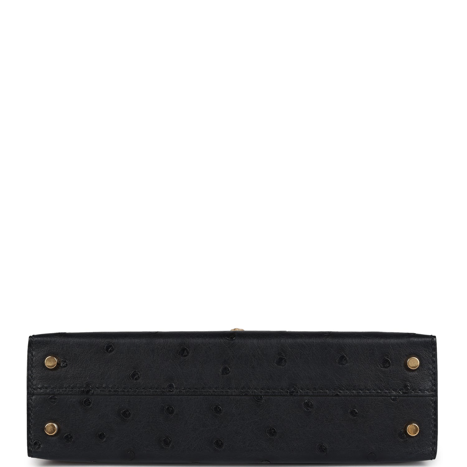 This Kelly, in the Sellier style, is in Black ostrich leather with gold hardware and has tonal stitching, two front straps with front toggle closure, single rolled handle and removable shoulder strap.