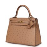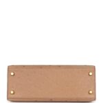 This Kelly, in the Sellier style, is in Chai Ostrich with gold hardware and has tonal stitching, two straps with front toggle closure, clochette with lock and two keys, single rolled handle and removable shoulder strap.