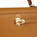 This Kelly, in the Sellier style, is in Sesame epsom leather with gold hardware and has tonal stitching, front flap, two straps with center toggle closure, clochette with lock and two keys a single rolled handle and removable shoulder strap.