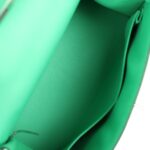 This Kelly, in the Sellier style, is in Vert Comics epsom leather with palladium hardware and has tonal stitching, front flap with two straps, front toggle closure, clochette with lock and two keys, and single rolled handle.