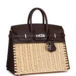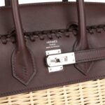 This rare Picnic Birkin Bag is in Rouge Sellier swift leather and Osier wicker with palladium plated hardware and has tonal stitching, front flap, two straps with toggle closure and double top handles.