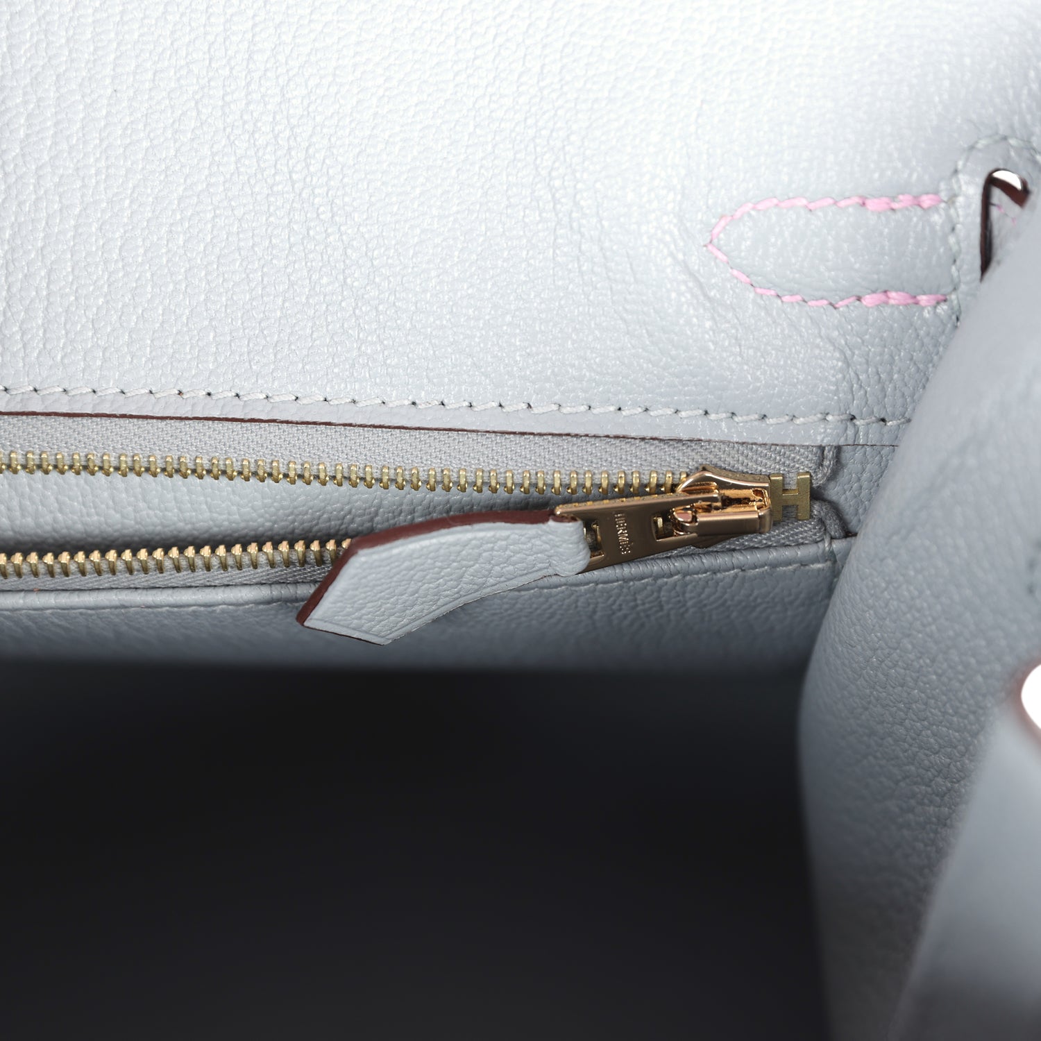 The interior is lined with Bleu Glacier chevre and has one zip pocket with an Hermès engraved zipper pull and an open pocket on the opposite side.