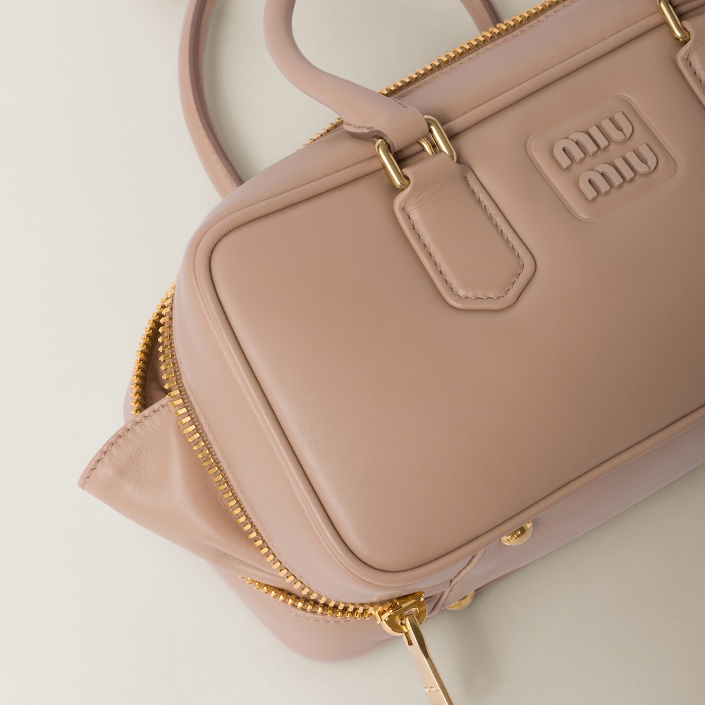 This Arcadie leather bag expresses a notion of fashion as a means of translating a reaction to current reality into material form. The light padding gives the bag a voluminous look and a cosmopolitan style. The lettering logo, which echoes the finishes of the metal hardware, crosses the boundaries between function and decoration and helps to define the distinctive and iconic aesthetic of the top-handle bag.