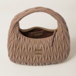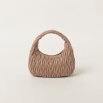 The Wander bag, reinterpreted season after season, has become an iconic accessory of Miu Miu collections. $ Made in matelassé nappa leather, the bag is characterized by the sophisticated, three-dimensional created by the fine workmanship. The hobo shape, blending retro inspirations and contemporary elegance, becomes a new synonym of modern femininity.