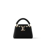 Part of the new permanent Flower Crown line, this sophisticated Capucines Mini design is adorned with a crown of mother-of-pearl effect Monogram flowers, finished with elegant gold-toned hardware. The refined design opens to reveal a compartmented interior fitted with multiple pockets, and features a removable strap, offering numerous carry options.