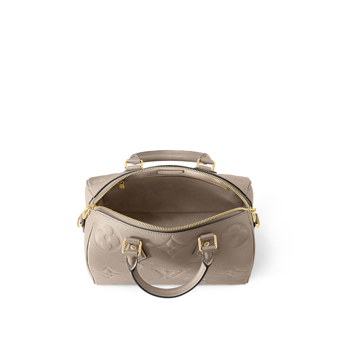 Made from grained Monogram Empreinte leather with the embossed Oversized Monogram pattern, the Speedy Bandoulière 25 handbag radiates discreet style. Its unmistakable lines, Toron handles, engraved padlock, adjustable and detachable strap make this bag instantly recognizable. The generous capacity and body-friendly construction make it eminently practical.
