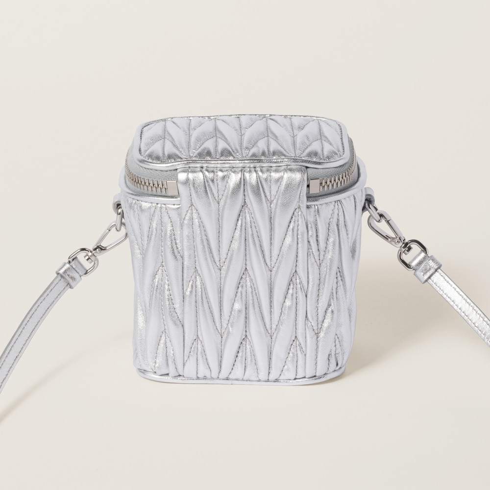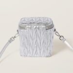 Fine matelassé workmanship gives this nappa leather micro bag a compact and modern look thanks to the three-dimensional, textured, and extremely sophisticated effect. The Miu Miu logo stands out with an iconic and instantly recognizable touch.