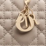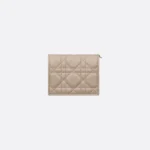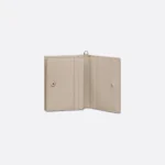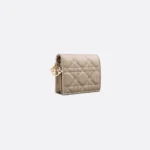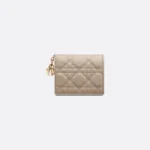 The Lady Dior Gardenia wallet is both compact and spacious. The combination of sand-colored lambskin with Cannage topstitching and detachable D.I.O.R. charms creates a chic and timeless look. The miniature accessory can hold all the daily essentials and may easily be coordinated with other items from the Lady Dior line.