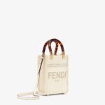 Mini Sunshine Shopper bag made of white leather with hot-stamped “FENDI ROMA” and stiff tortoiseshell-effect plexiglass handles.