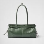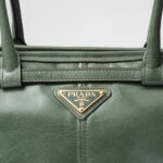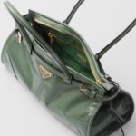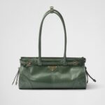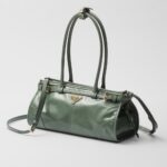 This pragmatic and refined handbag is made of soft leather with a glossy finish that emphasizes its versatile, modern allure. The geometric design blends different influences into one style with a distinctive but sleek aesthetic. Embellished by the sophisticated strap detail, the rectangular silhouette has zipper pockets inside. The enameled metal triangle logo completes the look with its iconic signature.