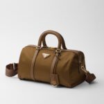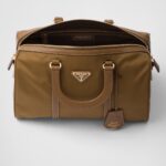 An archive silhouette with timeless allure is reinterpreted with a contemporary design, emphasized by the exclusive combination of two of Prada’s iconic materials. Made of Re-Nylon, the innovative regenerated and sustainable nylon fabric, the top-handle bag with a structured shape is enriched with elegant details in Saffiano leather and metal hardware. The pragmatic but sophisticated accessory is embellished with the enameled metal triangle logo.