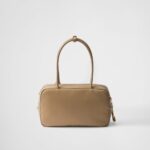 This structured top-handle bag, crafted from Re-Nylon and leather, presents a timeless silhouette with sophisticated charm. The metal hardware and the enameled metal triangle logo adorn the style, while the zipper and padlock closure add a unique accent.