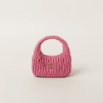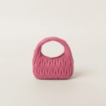 The Wander bag is reinterpreted season after season, becoming an iconic accessory of Miu Miu collections. Made of matelassé nappa leather, the bag is characterized by the sophisticated, three-dimensional effect created by the refined workmanship. The hobo shape, blending retro inspirations and contemporary elegance, becomes a new synonym of modern femininity.